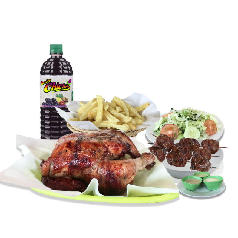 Bife + 1/4 de pollo + papas + 2 Anticuchos + Mollejitas + 2 Hot Dog +Chuleta + Chorizo + Pechuga de pollo +Morcilla + Ensalada